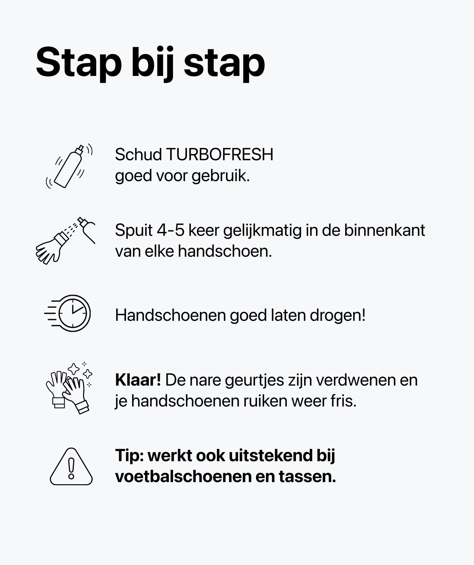 Maak je handschoenen na elke sportactiviteit eerst schoon met TURBOCLEAN, schud daarna TURBOFRESH goed. Spray 4–5 keer gelijkmatig aan de binnenkant van elke handschoen en laat goed drogen – klaar! De nare geurtjes verdwijnen en je gloves ruiken weer heerlijk fris.